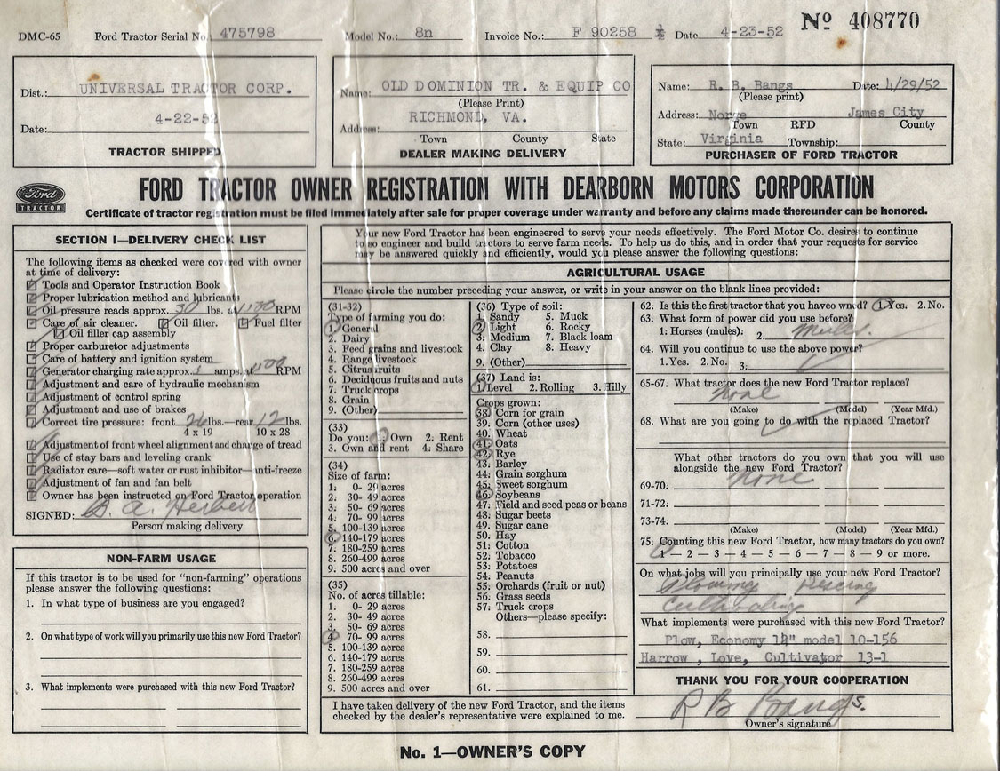 For those who have not seen it, here's the original one that I was lucky enough to get with my 8N from the original owner to see how they were filled out at this dealership in Richmond, VA:
