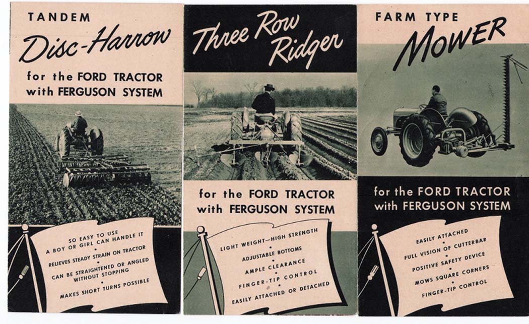 This dealer ad brochure was published in 1941 for the Ford 9N tractor and basic implements:  Please review our tutorial in our How-To's - Misc. section on how to best capture posted images to your PC to save, edit and print as you need. Printing them from your browser (Internet Explorer, FireFox, etc.) will NOT work reliably.